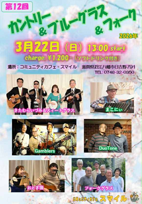 毎年恒例の「ブルーグラス・フォーク・カントリー」今年も楽しい顔ぶれが集まってライブをします。どうぞ、ご一緒にお楽しみ下さいませ。