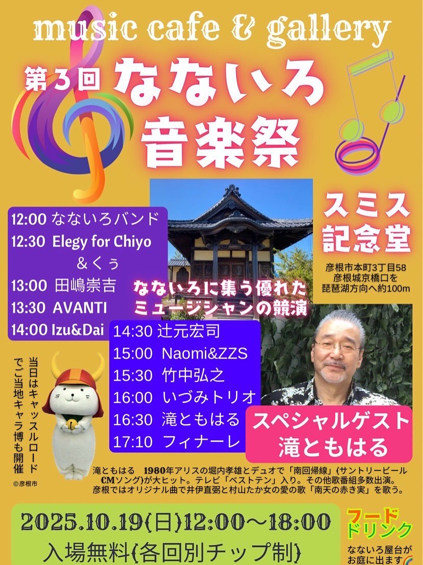 涼しくなってきましたね。10/19(日)スミス記念館@彦根にて、「第三回なないろ音楽祭」が開催されます情緒溢れるスミス館での音楽祭、スペシャルゲスト滝ともはる さんが出演されます。皆様どうぞお楽しみ下さいませ。私はジャジーな★いづみトリオ★で16:00に出演します。主催なないろカフェ のりこさん&島田さん